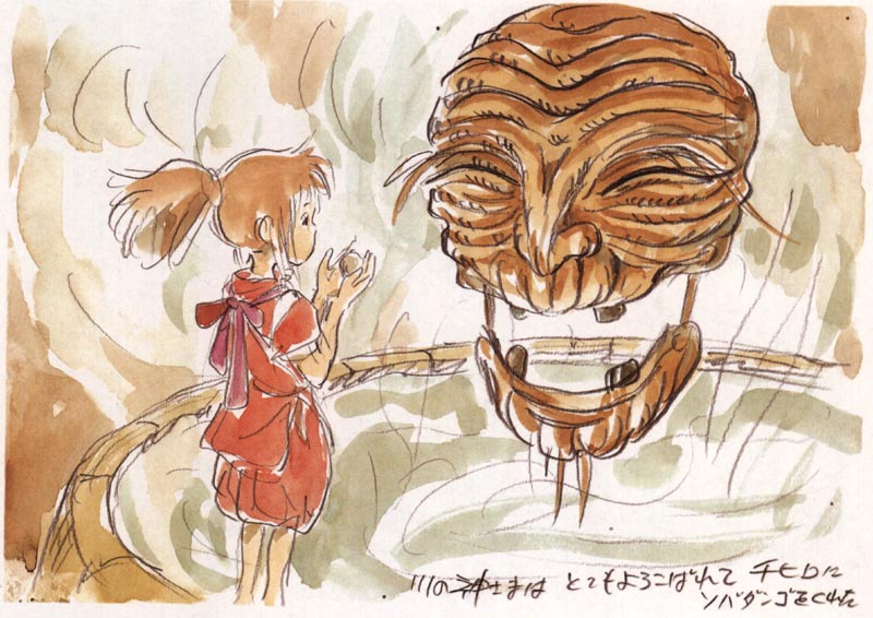 A dare voce a questo messaggio, a un tratto compare nelle terme il dio del fiume Okusare-Sama scambiato per lo Spirito del cattivo odore, il quale in realtà necessita di amorevoli cure per espellere dal suo corpo l’enorme congestione di melma e ciarpame…non a caso Sen verrà eloquentemente ricompensata per l’attenzione nei confronti della Natura (la creazione di questo personaggio nasce da un’esperienza diretta di Miyazaki della pulizia di un fiume vicino casa).