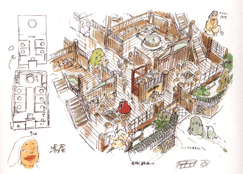 Tra mostri e spiriti di ogni forma, prolifera una struttura verticale, dai bassifondi delle caldaie di Kamaji (dall’aspetto simile a un ragno, simbolo di operosità e abilità) alla cima delle terme, residenza privata della Maga Yubaba.